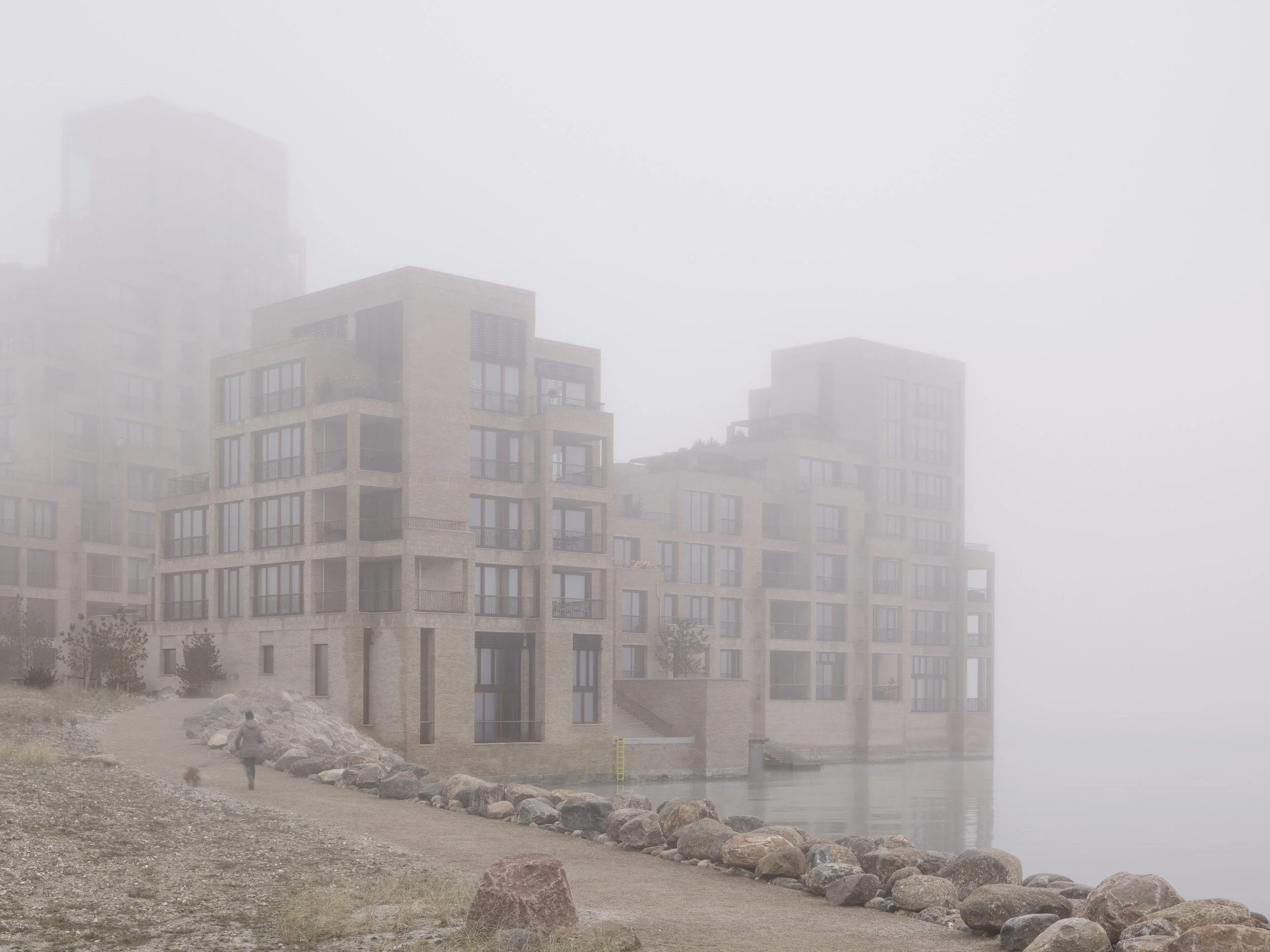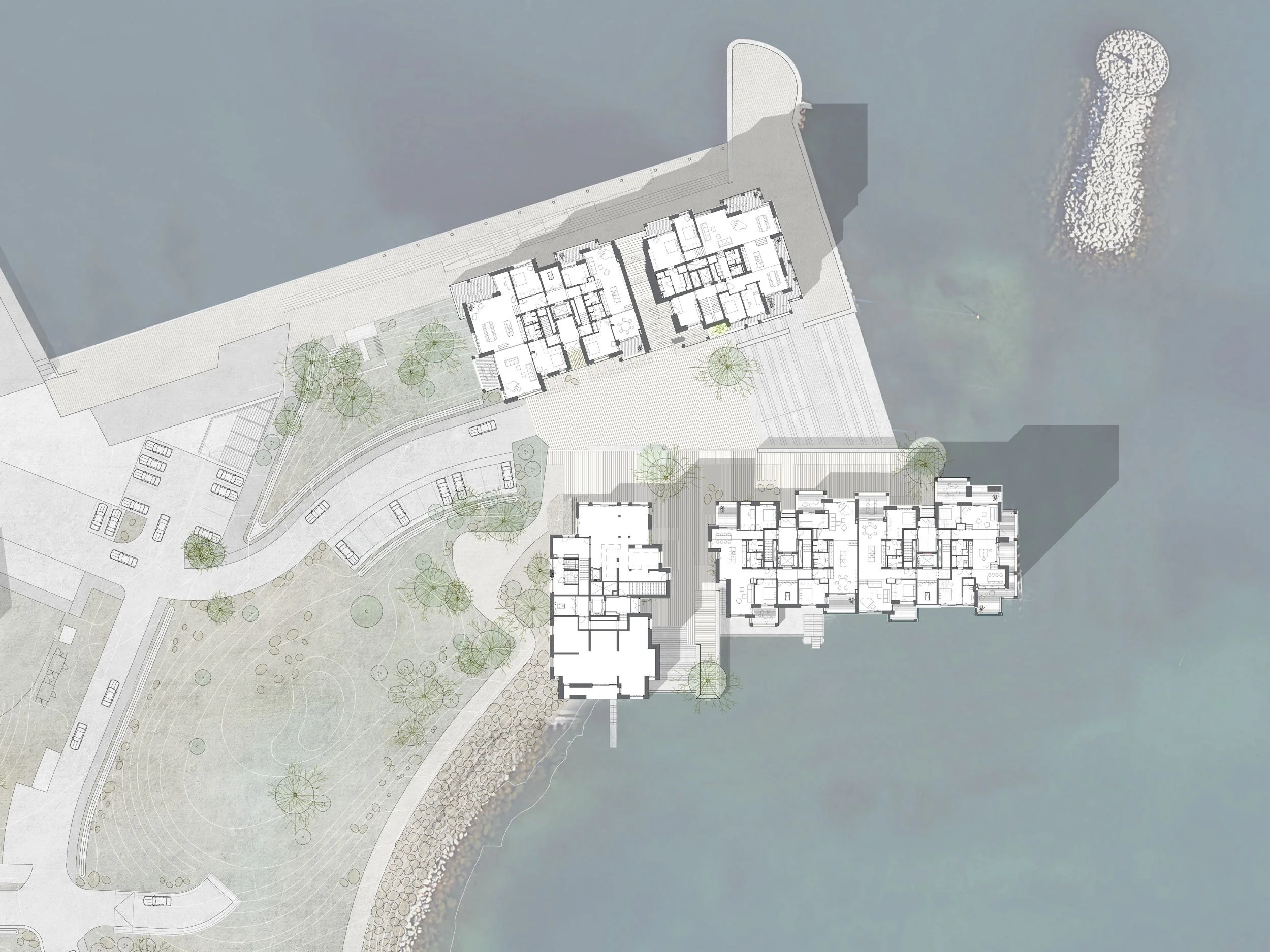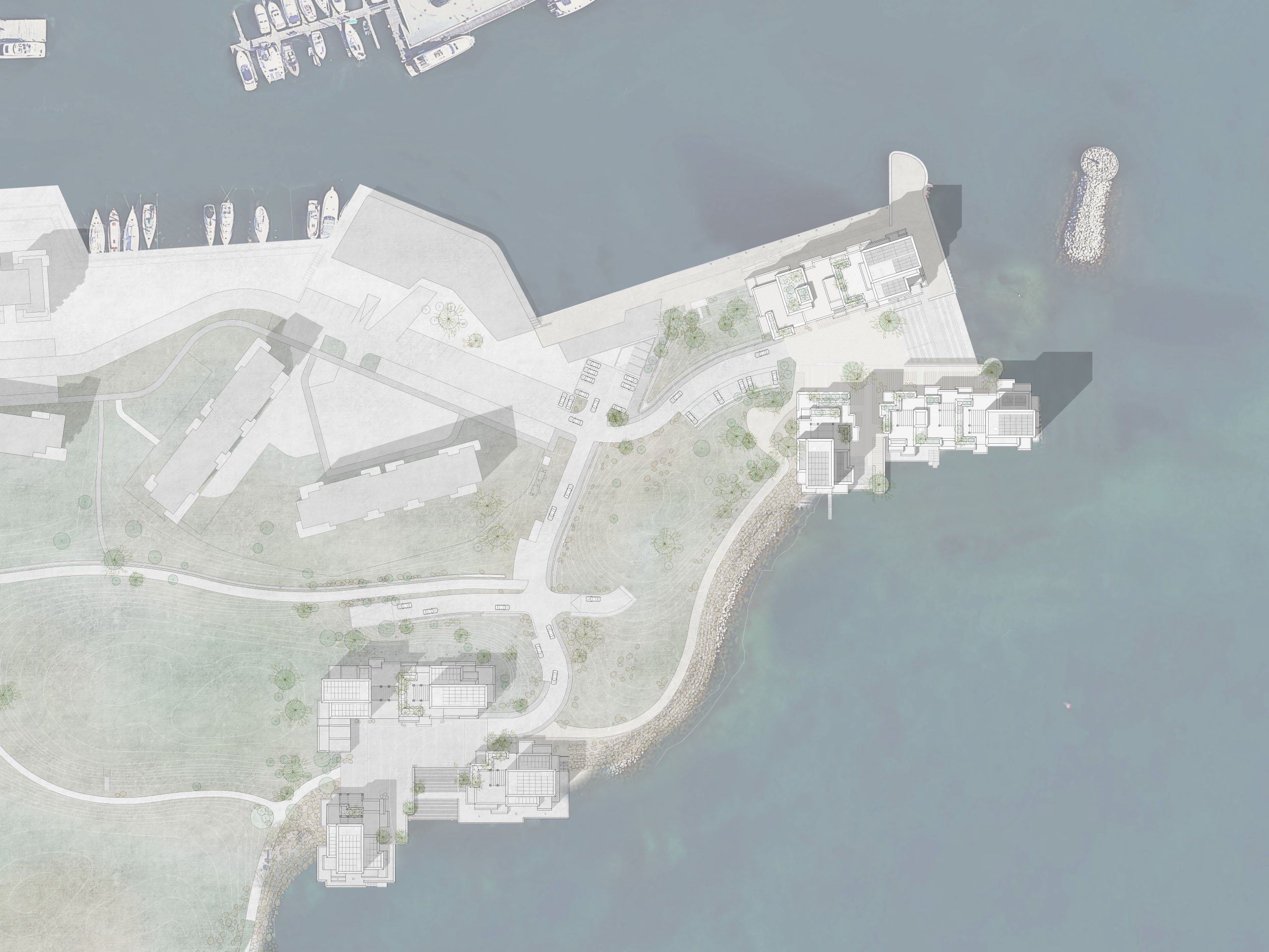 De tre kysthuse er trukket helt ud til vandet med hver deres lille havn. Sammen med store nordiske sten tegner de kystlinjen op, og indrammer det strandengslignende landskab, inspireret af de milde danske kystlandskaber, der veksler mellem lavninger og kuperede bakkedrag.