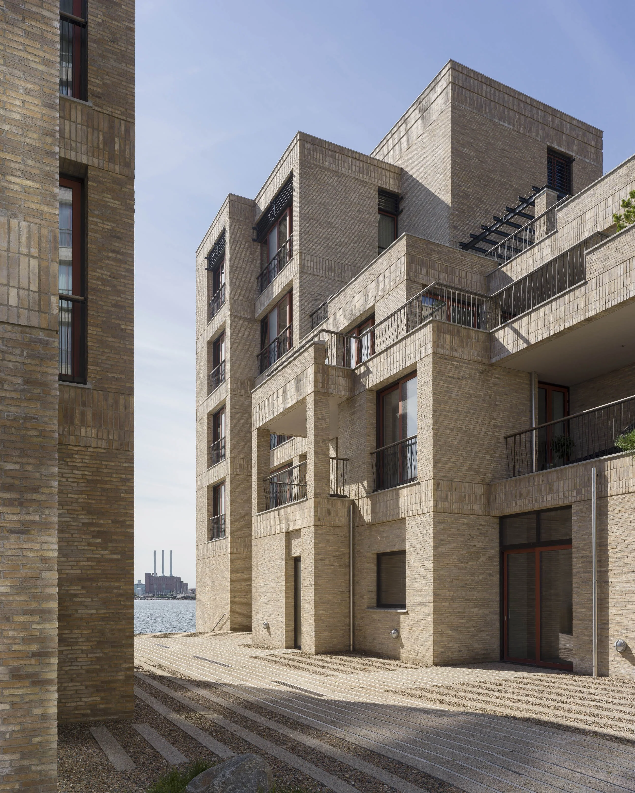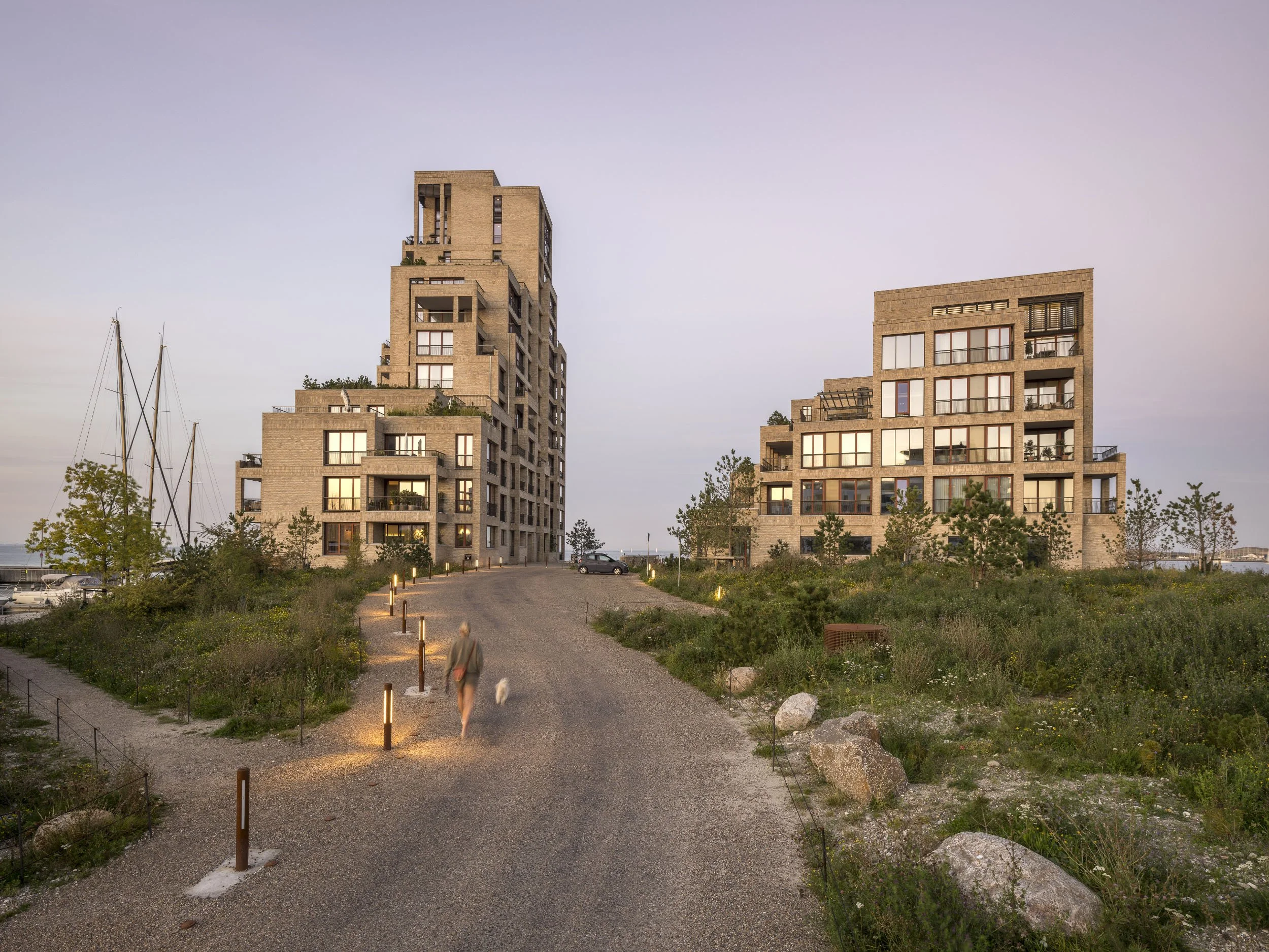 I 2008 lavede vi sammen med Gentofte Kommune en ny vision for Tuborgs gamle industriområde. I den gamle lokalplan skulle der bygges boligblokke på hele området, hvilket betød at grunden blev skåret igennem med meget lidt plads til fællesarealer og naturen. Ved i stedet at placere boligerne ud til kysten og grave parkeringsområderne ned har vi skabt plads til et stort sammenhængende strandengslignende landskab. Bakkedraget er den eneste bygning inde på grunden. Boligblokken fletter sig ind i det gamle Hellerup og ligger som en fortsættelse af boligbebyggelsen Ved Eltham fra 1937.